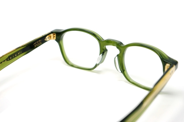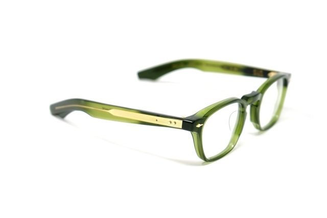 MATERIAL: 10MM BLOCK, BOTTLE GREEN W/ CLEAR ACETATE FRAME, CUSTOM DOUBLE LAMINATED ACETATE TEMPLES FT. PRECIOUS 18K DARK GOLD HARDWARE