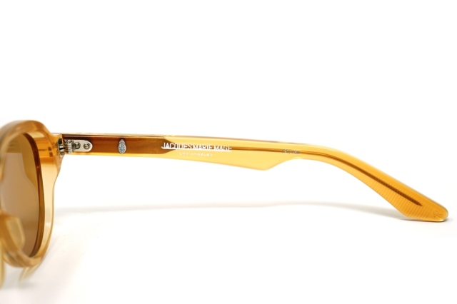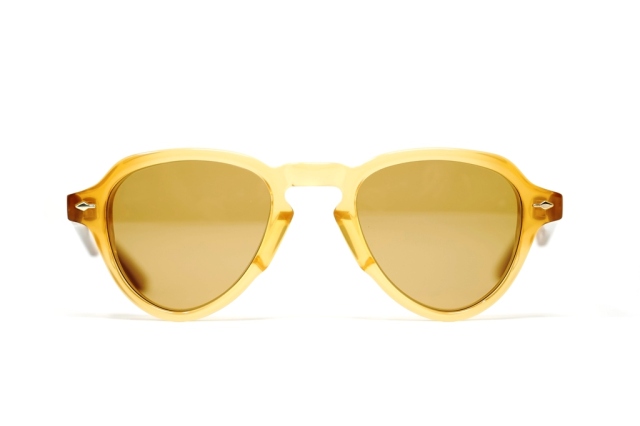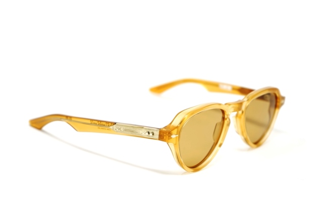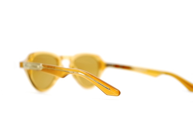 MATERIAL: 10MM BLOCK, POLISHED MARIGOLD CLEAR ACETATE FRAME, CUSTOM DOUBLE LAMINATED ACETATE TEMPLES FT. PRECIOUS METAL HARDWARE