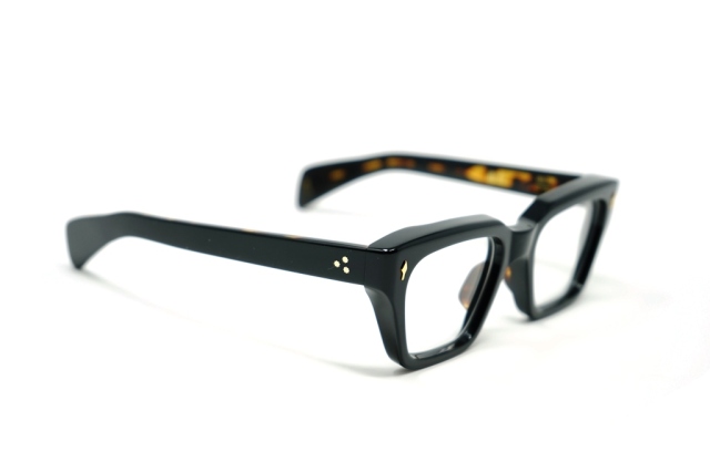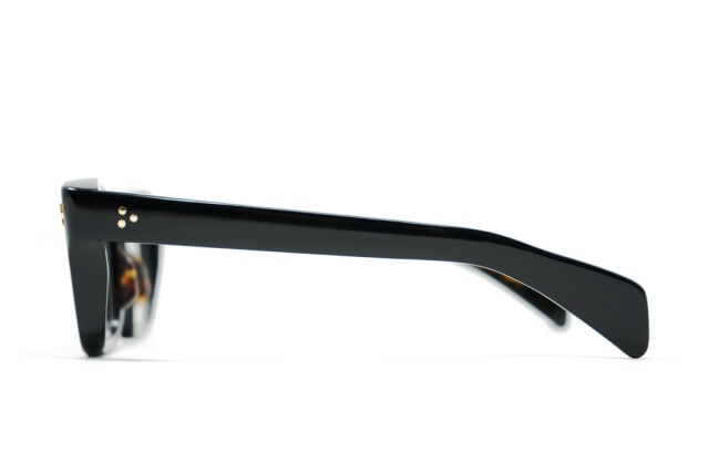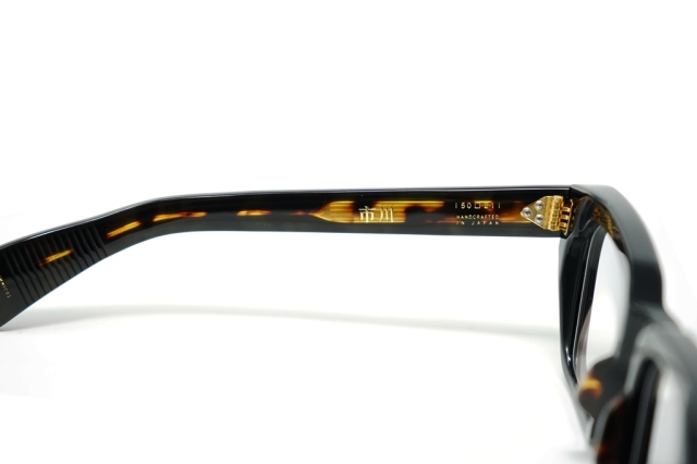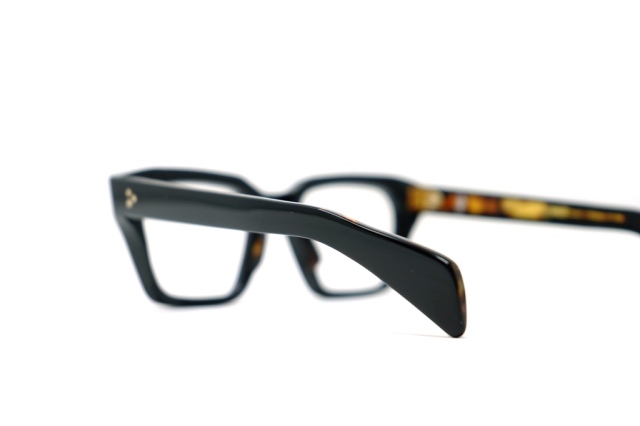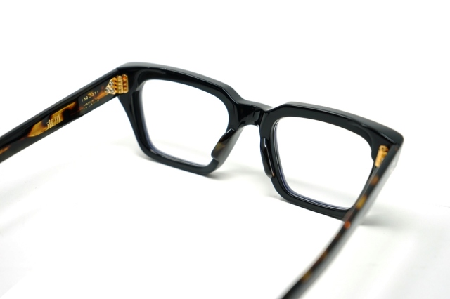 MATERIAL: 10MM POLISHED BLACK W/ TORTOISE CURED CELLULOSE ACETATE FRAME CUSTOM DOUBLE LAMINATED ACETATE TEMPLES FT. PRECIOUS METAL HARDWARE