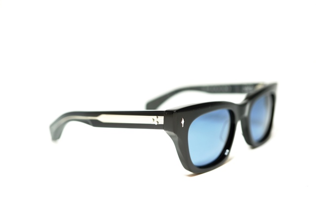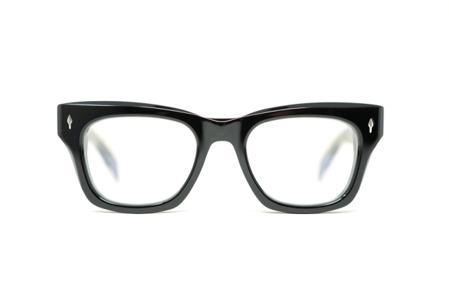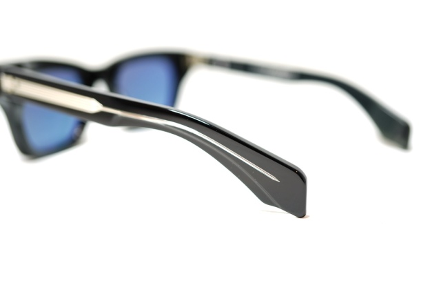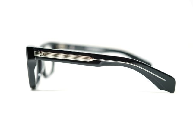 MATERIAL: BLACK POLISHED W/ CLEAR CURED CELLULOSE ACETATE FRAME, CUSTOM DOUBLE LAMINATED ACETATE TEMPLES FT. PRECIOUS METAL HARDWARE