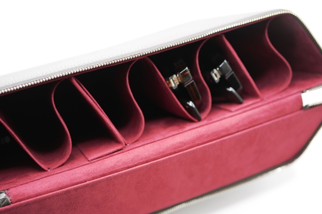 ファスナーを開けていただくと、中から2つのポケットが現れます。このポケットは仕切りが固定されていないため、大きなフレームや小さなフレームを混合でしまっても、それぞれに合うよう自動的に調整されます。ポケットには化繊のスエードを使用しています。肌触りがなめらかであり、メガネやサングラスにとって居心地の良い空間になっています。
