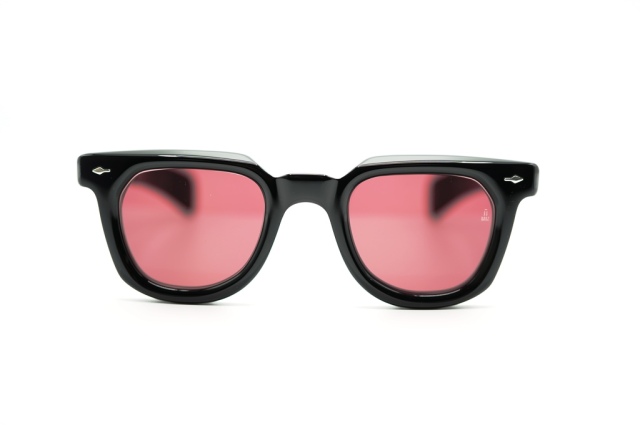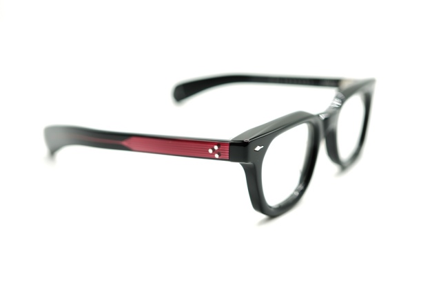 MATERIAL:BLACK 10MM CURED CELLULOSE ACETATE FRAME CUSTOM ACETATE TEMPLES FEATURING PRECIOUS METAL HARDWARE AND RED CR39 LENSE