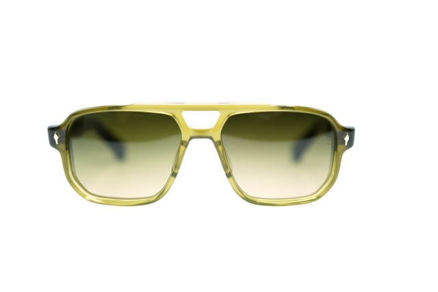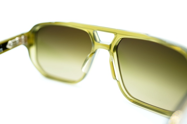 MATERIAL:GREEN 10MM CURED CELLULOSE ACETATE FRAME WITH CUSTOM DOUBLE LAMINATED ACETATE TEMPLES AND GREEN POLARIZED LENSES