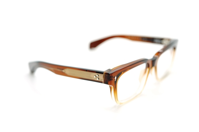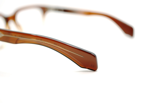 MATERIAL: BROWN W/ INNER POLISHED ACETATE FRAME, CUSTOM DOUBLE LAMINATED ACETATE TEMPLES FT. PRECIOUS METAL HARDWARE