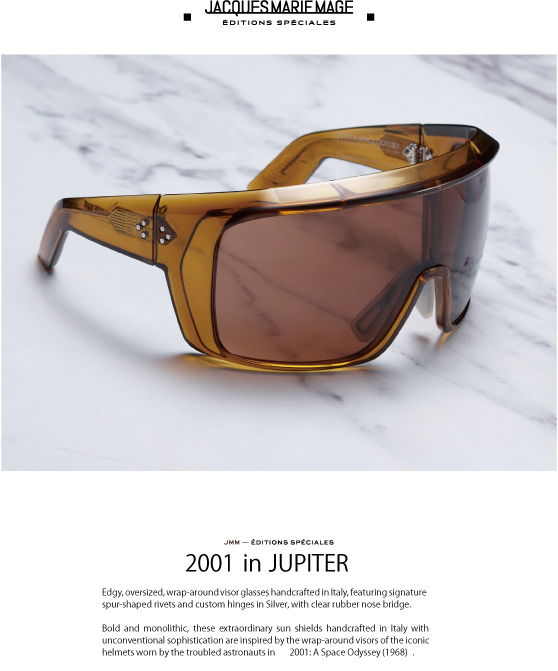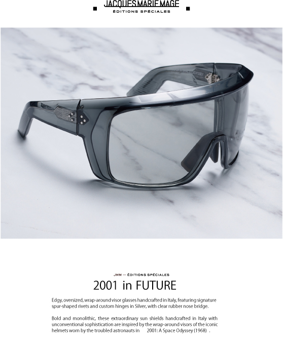 Bold and monolithic, these extraordinary sun shields handcrafted in Italy with unconventional sophistication are inspired by the wrap-around visors of the iconic helmets worn by the troubled astronauts in 2001: A Space Odyssey (1968).