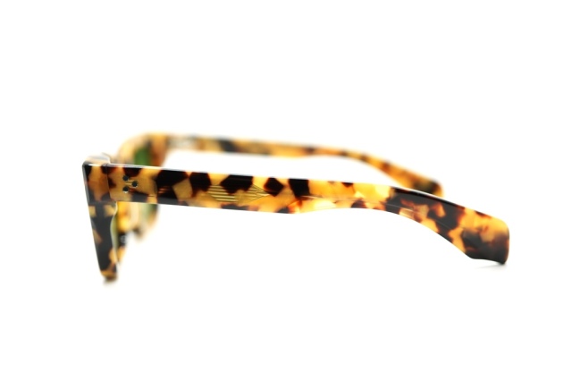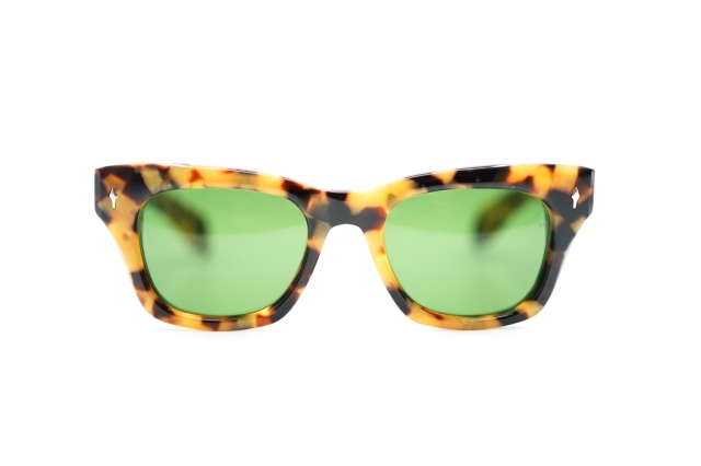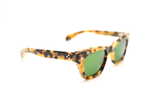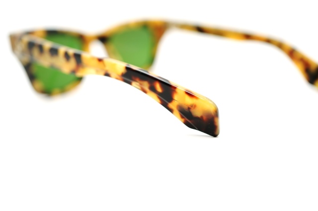 MATERIAL: HAVANA 10MM CURED CELLULOSE ACETATE FRAME WITH CUSTOM ACETATE TEMPLES FEATURING PRECIOUS METAL HARDWARE AND GREEN LENSES