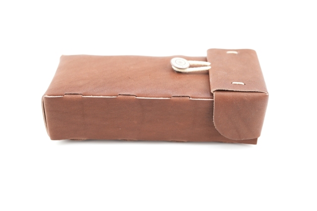 紙器や段ボールなどのパッケージの打ち抜き加工に用いられるビク型(トムソン型)と呼ばれる刃で本革を抜き加工し、ミシン縫製を一才行わず、紙箱のように組み立てられたユニークな構造。DIFFUSERの純正ケースではリサイクルレザーを使用していましたが、本ケースでは栃木レザーの本ヌメ革を使用しています。経年変化を楽しめる革になっています。