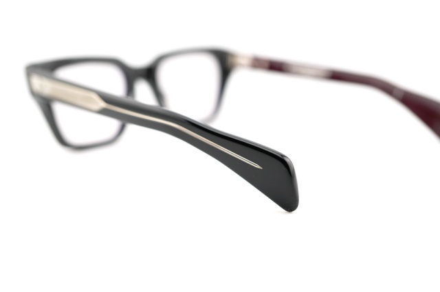 MATERIAL: BLACK 10MM CURED CELLULOSE ACETATE FRAME WITH CUSTOM DOUBLE LAMINATED ACETATE TEMPLES AND SUPERLIGHT GREY LENSES