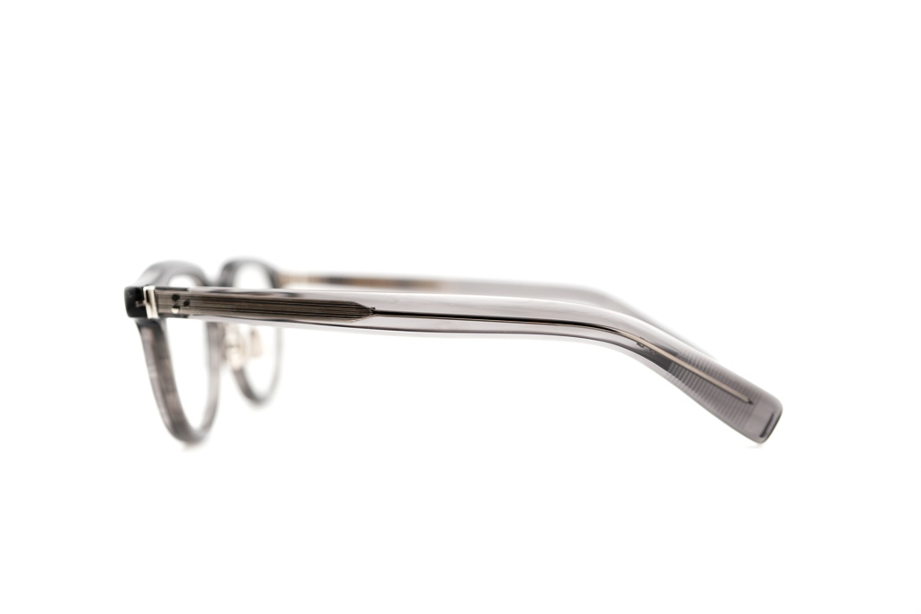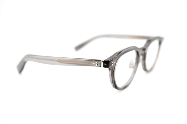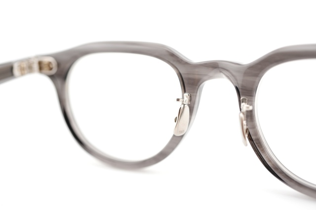 ブランドのマスターピースモデルの一つである「340」のリメイクデザイン。リムを中太に変え、テンプルもやや細手の新規パーツで組み上げた。フロントとテンプルの丁番もこのモデルのために作製したブランドのアイコンパーツであるミリタリー丁番。2+1PIN(一つだけ異なる大きさのPIN)、パテントを取得しているオリジナルの二股チタンパッドなど細部までこだわり抜いたディテールで構成されている。