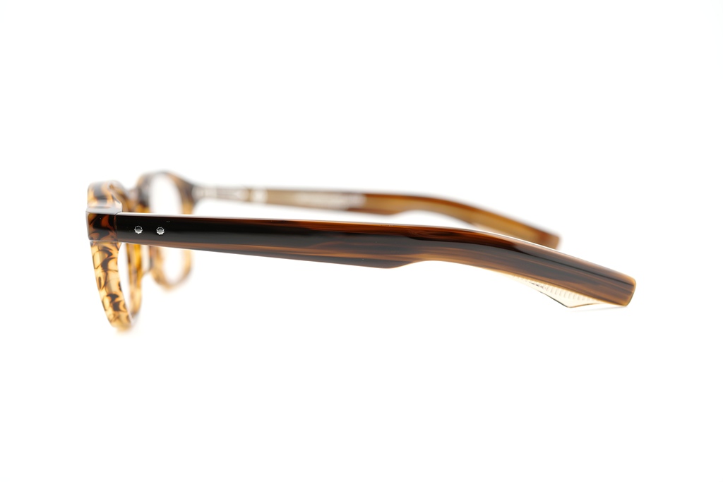 MATERIAL: 10MM BLOCK, BROWN POLISHED ACETATE FRAME, CUSTOM DOUBLE LAMINATED ACETATE TEMPLES FT. SILVER HARDWARE