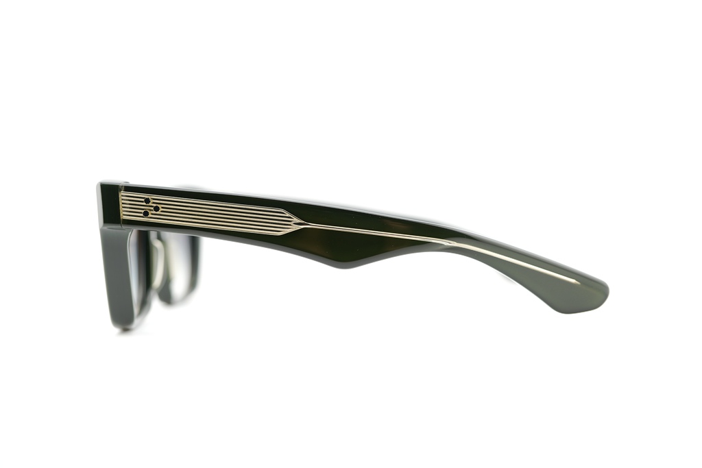 10mm cured cellulose acetate frame in polished green, with custom double-laminated temples composed of clear beige exteriors and polished green interiors, complemented by armolite 6-base lenses in midnight gradient with backside anti-reflective treatment