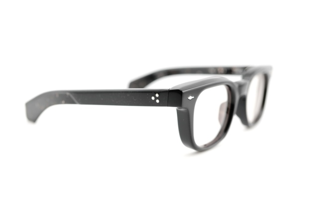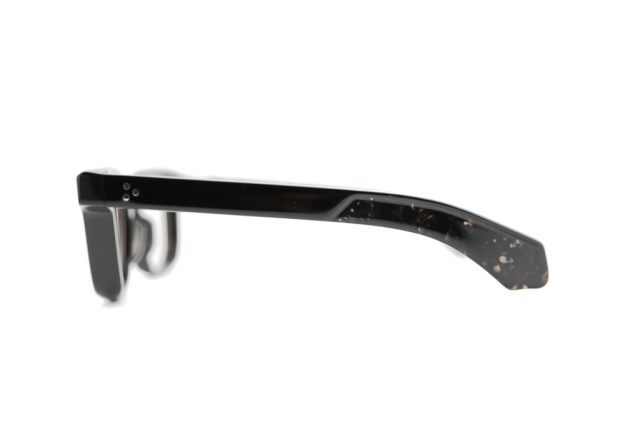 MATERIAL: 10MM BLOCK, POLISHED BLACK ACETATE FRAME, CUSTOM DOUBLE LAMINATED ACETATE TEMPLES FT. PRECIOUS METAL HARDWARE