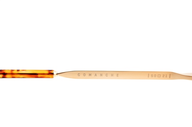 An homage to the sophistication and prowess of the Native American nation for which its named, these glasses daringly combine voluminous acetate and beta titanium with delicate tribal-inspired filigree and hand epoxy details to create an expression of bold refinement.